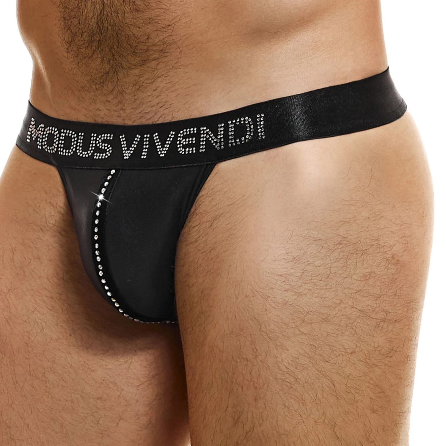 String taille basse en microfibre extensible satinée. Bande décorative sertie de cristaux sur la poche frontale non doublée. Ceinture élastique signée Modus Vivendi en lettres de cristal.