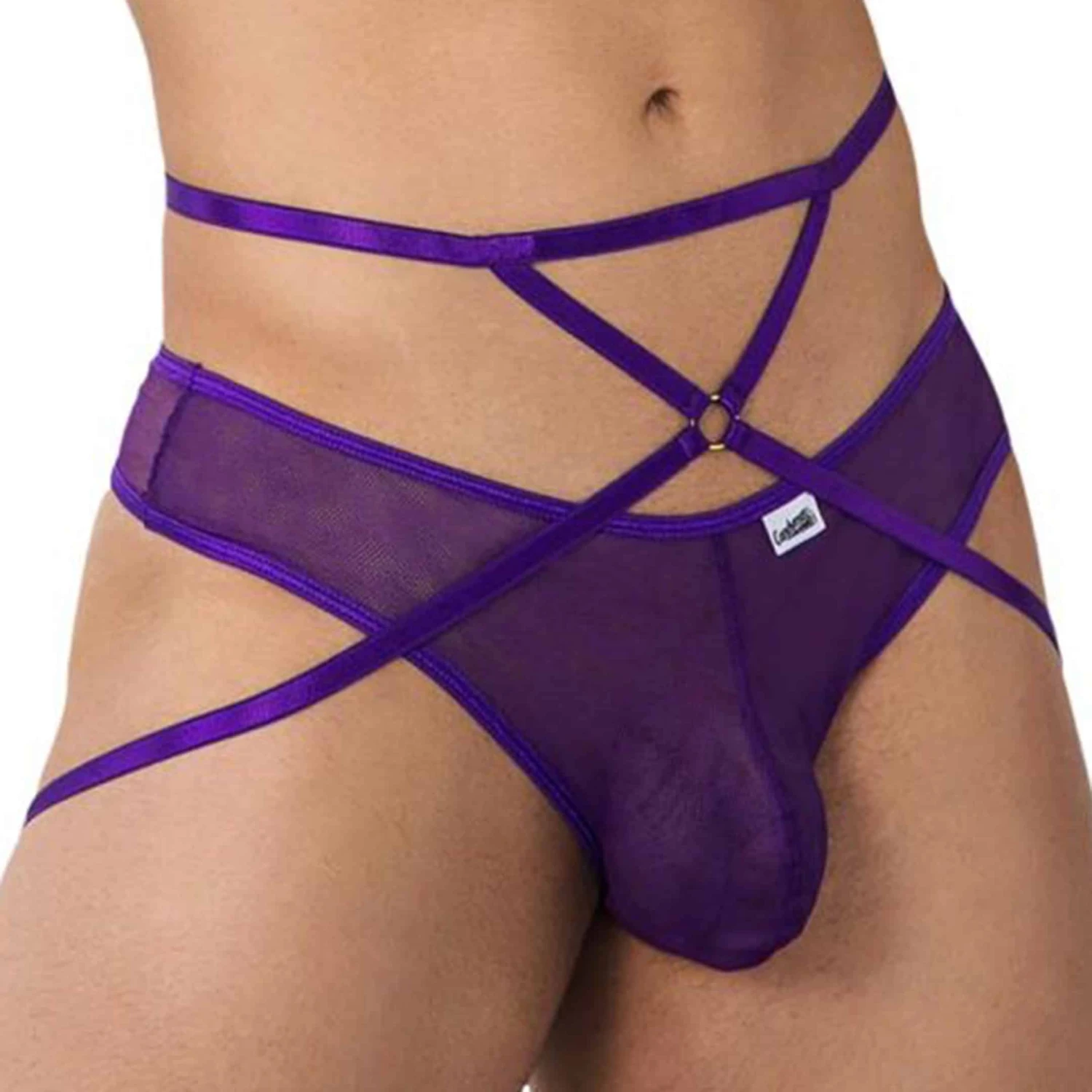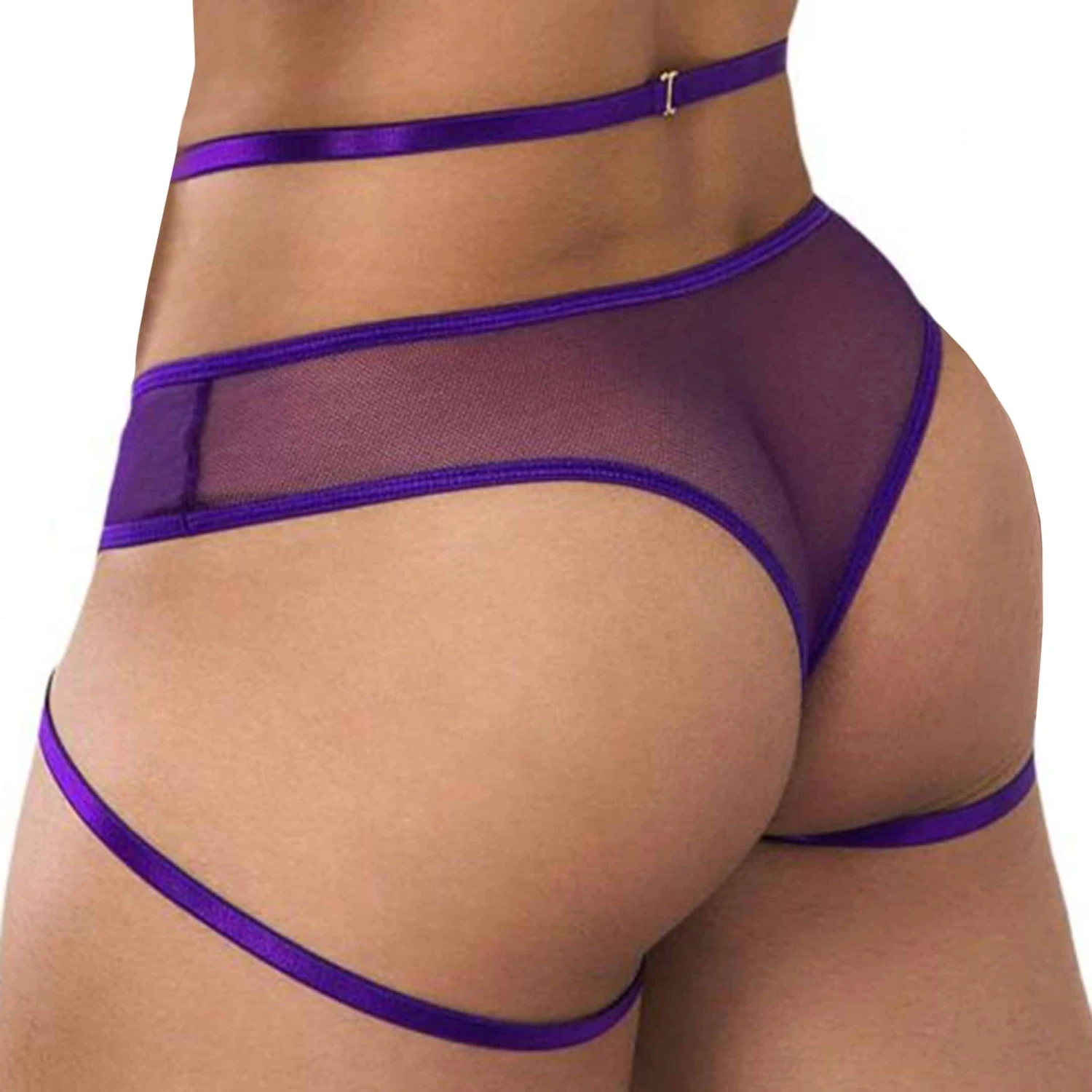 String très sexy en résille transparente. Fines bretelles autour de la taille et des fesses. Anneau métallique à l’avant et fermeture par crochet l’arrière.