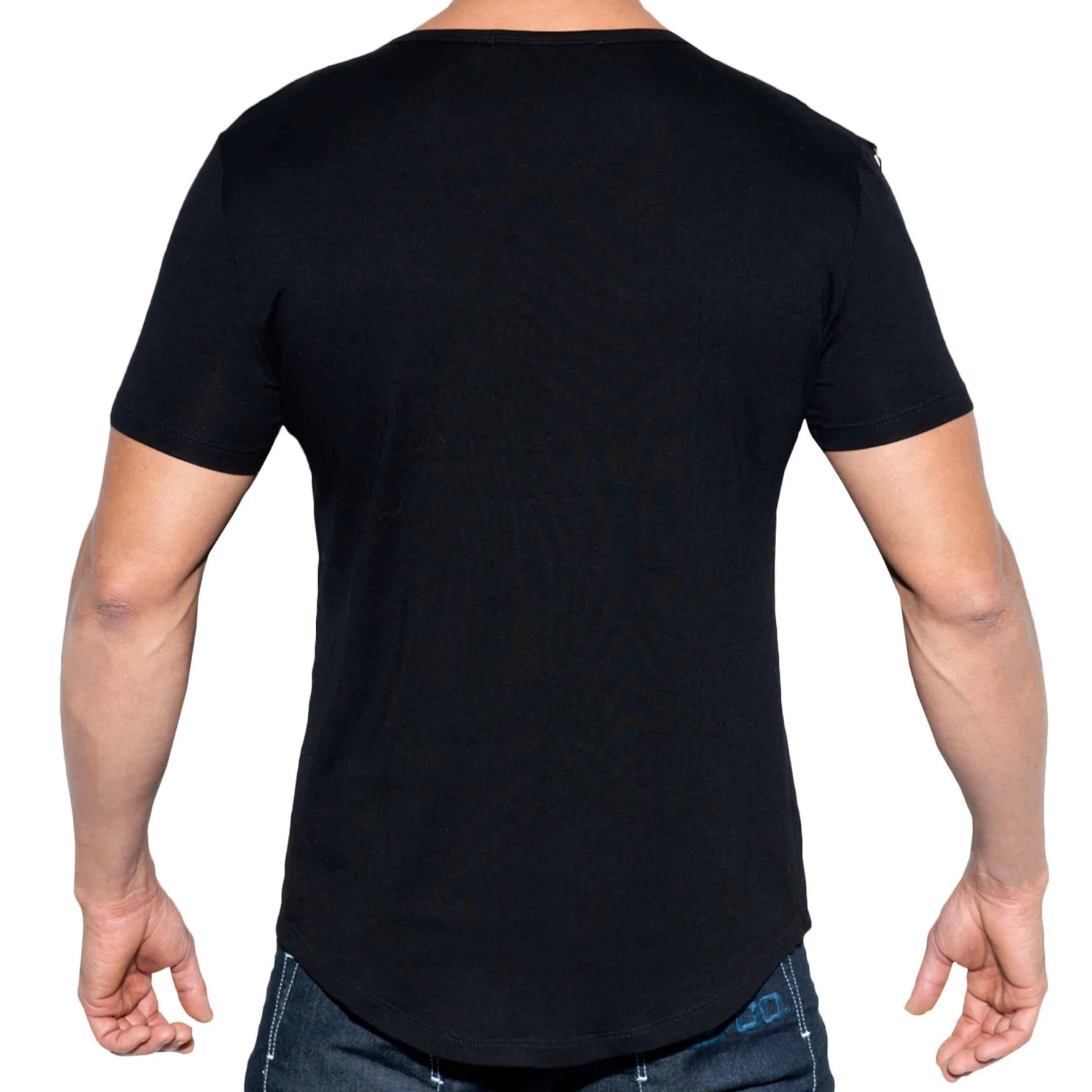T-shirt en viscose douce et soyeuse de couleur unie. Coupe courte et ajustée, arrondie en bas pour tomber parfaitement sur un pantalon. Col en V et manches courtes. Empiècement avec anneau métalique sur chaque épaule. Patch militaire ES Collection décoré de chaînettes sur la poitrine.