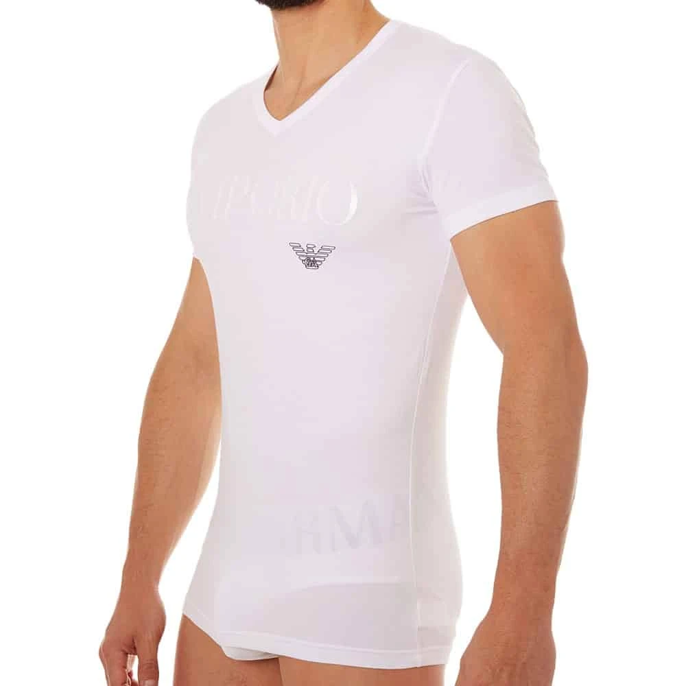 T-Shirt en coton extensible très doux et confortable. Coupe ajustée et élégante. Manches courtes et col en V. Grand logo Emporio Armani en silicone sur la poitrine et dans le dos.