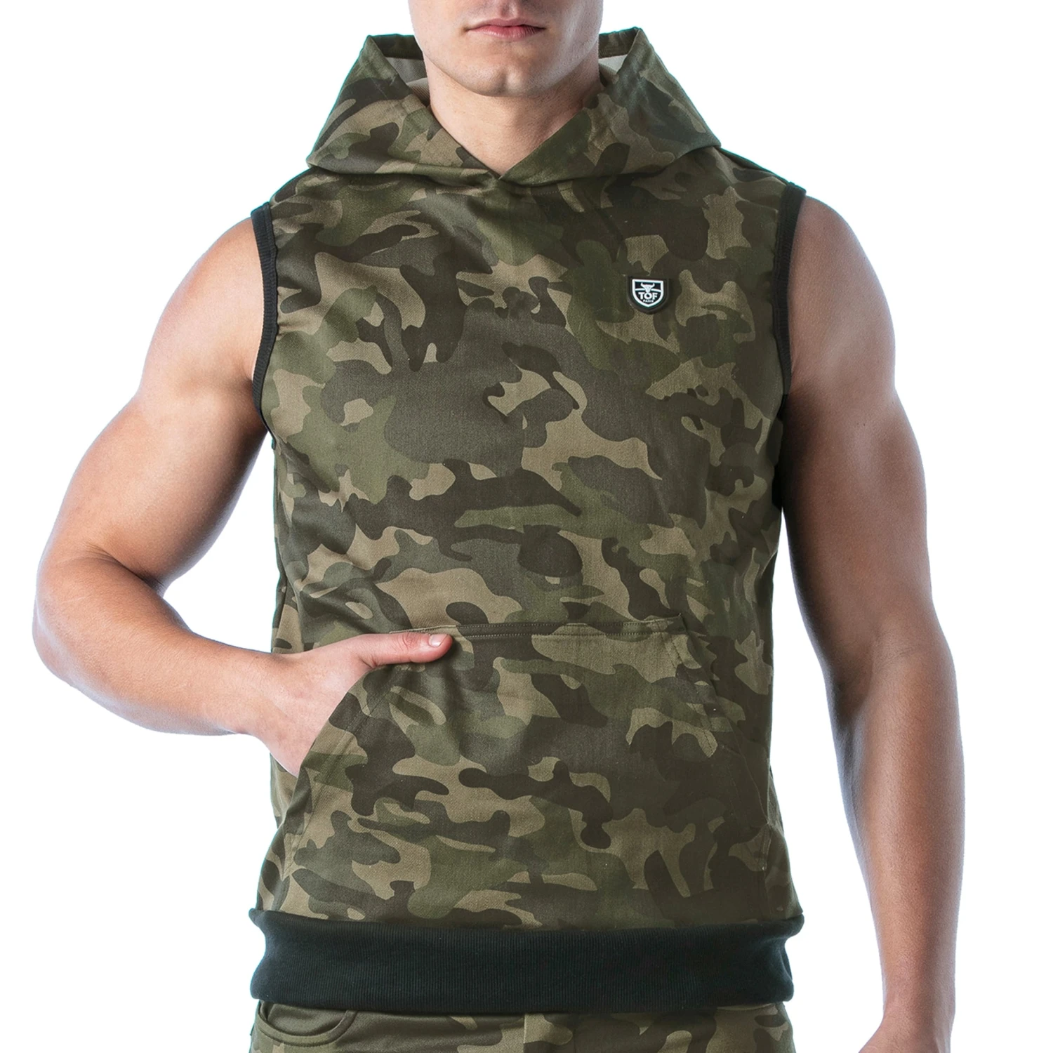 Veste sans manches en coton stretch mélangé, imprimé d’un motif camouflage. Capuche. Grande poche kangourou. Bande élastiquée à la taille. Logo TOF Paris sur la poitrine. Fabrication française.