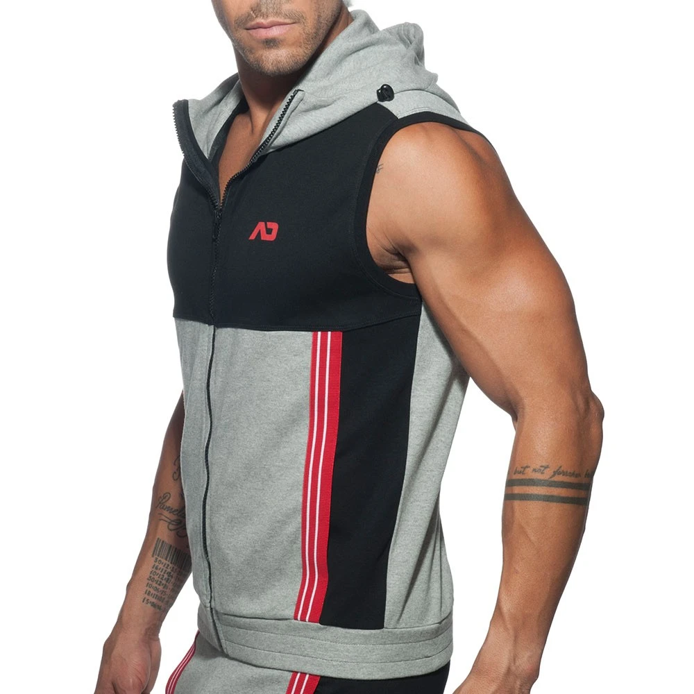 Veste sport sans manche, très ajustée, en pur coton. Capuche avec cordon de serrage. Bandes verticales de couleurs contrastées dissimulant 2 poches. Fermeture Eclair. Logo AD sur la poitrine. Fabriqué à Barcelone.