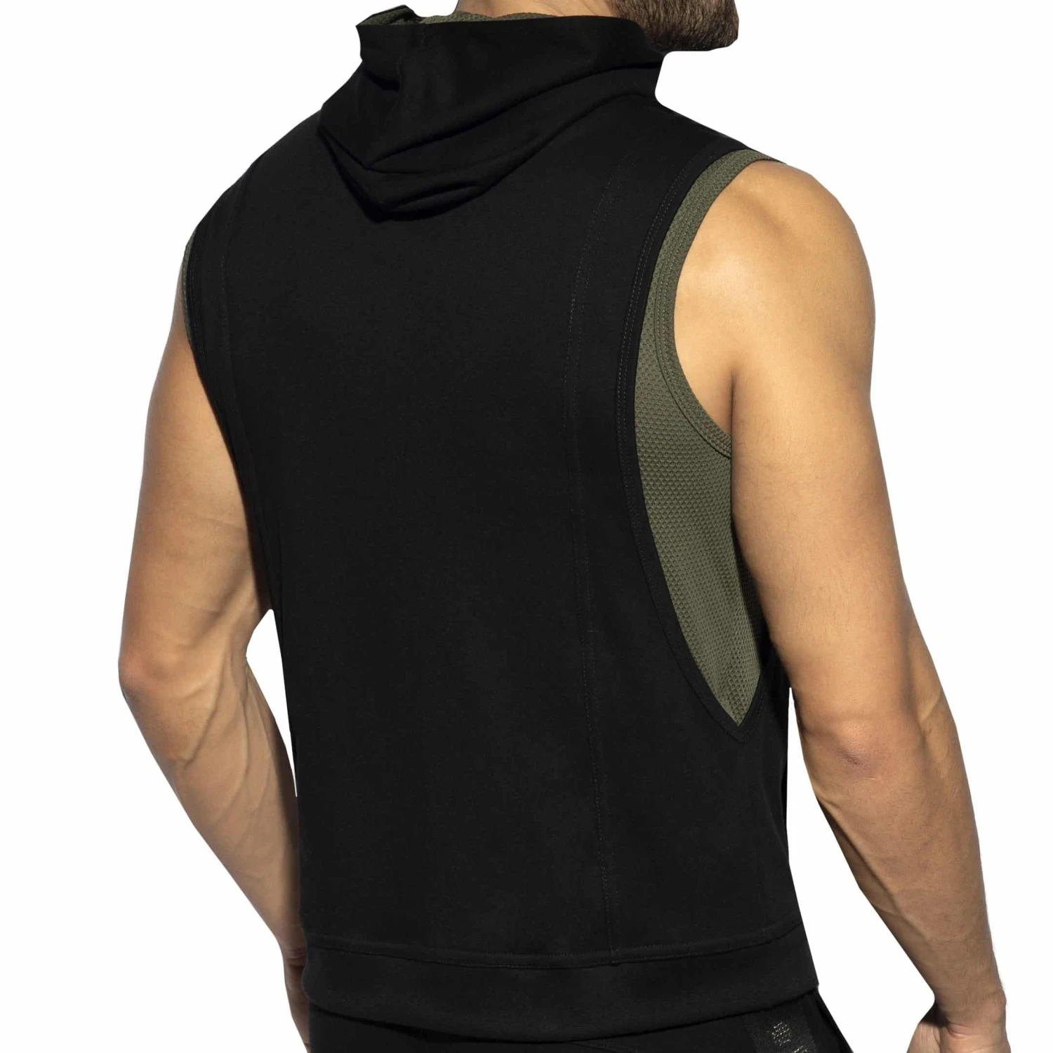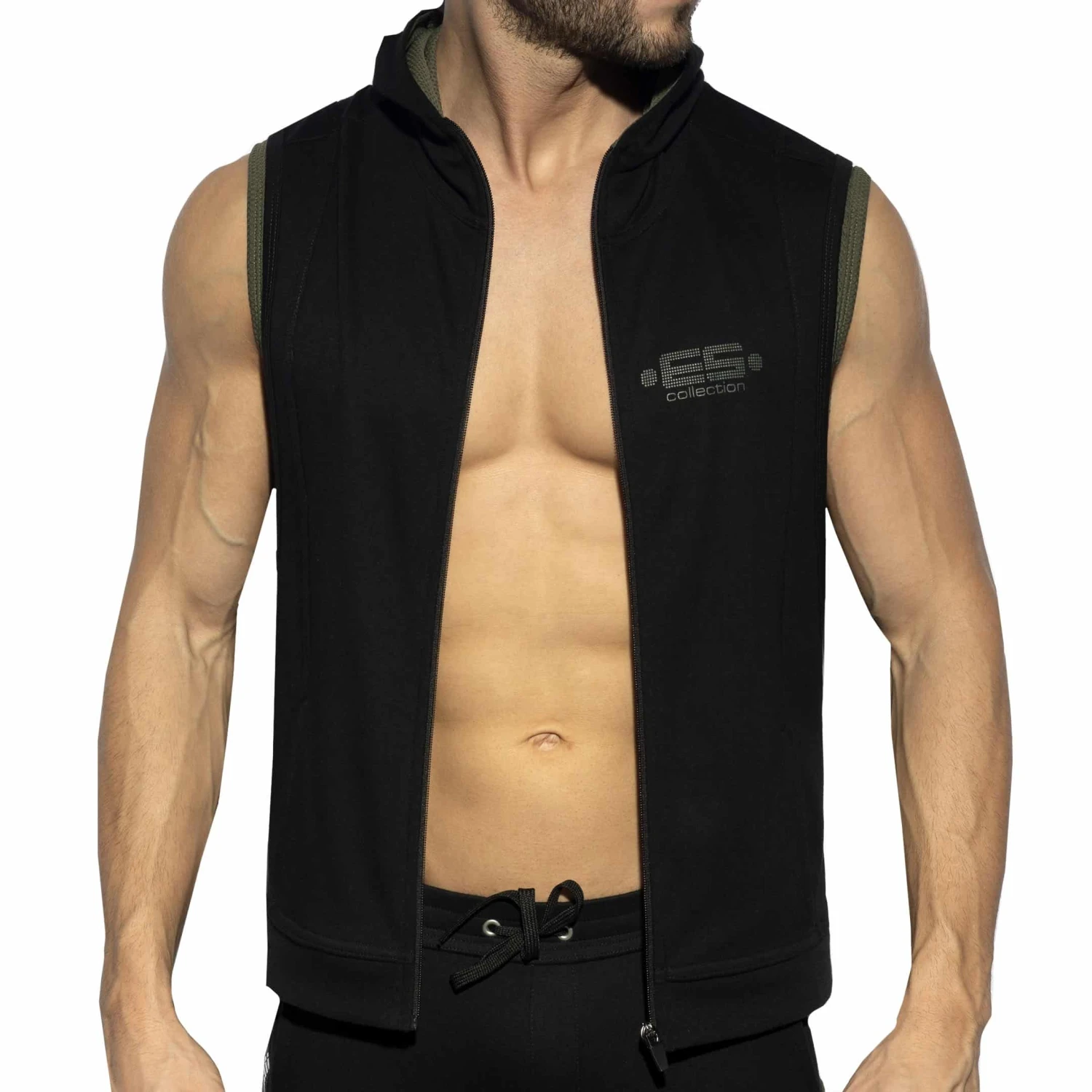 Veste sans manche très confortable en mélange de coton et microfibre stretch. Fermeture Eclair intégrale. Tissu contrasté texturé façon nid d’abeilles sur les côtés et la doublure de la capuche. 2 poches. Logo ES Collection imprimé sur la poitrine gauche.